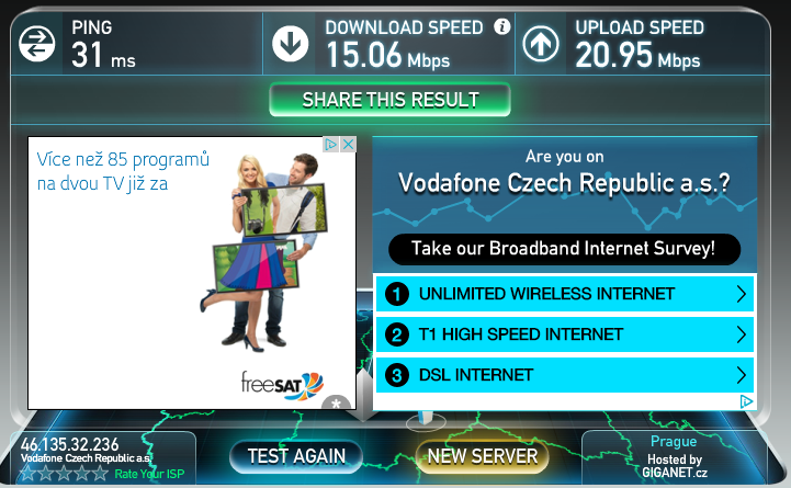 Takže potrvzuji kompatibilitu RB912 s miniPCIe Huawei ME909u-521. Pomohl upgrade nových packages. Bez nich ani rana. Aktuální verze 6.28 vytvořena 15.4.2015. Jen pro zajímavost přikládám speedtest, jak LTE modul s Vodafonem frčí.