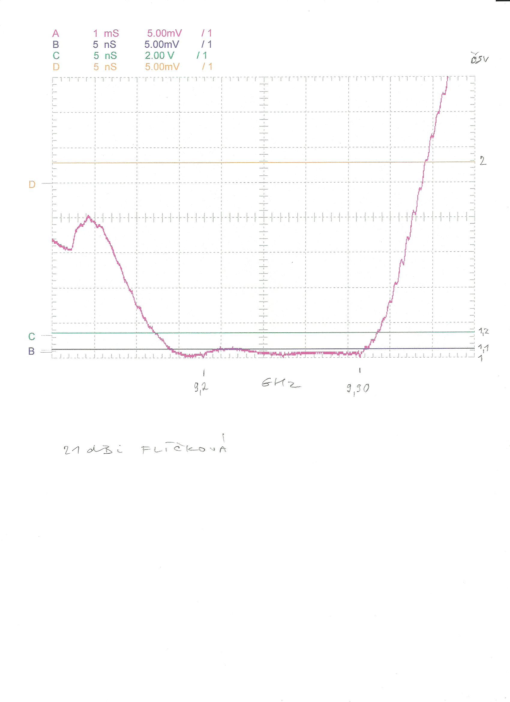 Posilam scan prubehu CSV flickove anteny pro pasmo 9-10 GHz.Z obrazku je patrne,jaky vliv na CSV ma pouziti vystupniho konektoru SMA.Antena je opatrena cca 20ti cm mikrovlnnym koaxialnim kabelem,ktery pouzivame i u nasich anten na 5 GHz,ovsem na konci kabelu NENI U.fl nebo MMCX,ale SMA konektor.