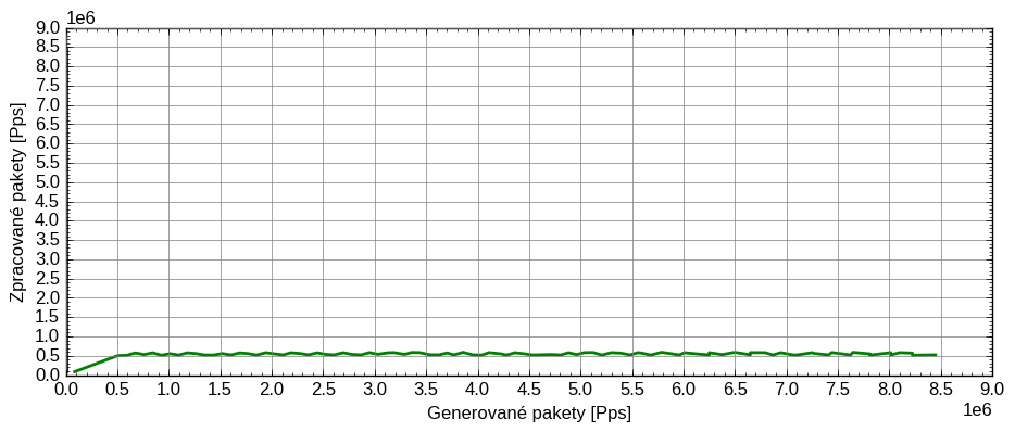 hledám vhodné řešení NATu na 10Gb linkách. Dostal jsem doporučení na MikroTik RouterOS. Tak jsem si řekl, že RouterOS vyzkouším. Výsledek mých testů byl docela zajímavý. Nejdříve jsem se snažil testovat na novějším stroji od Dellu. Docela mně překvapilo, že RouterOS s tímto strojem nenabootoval, u druhého stroje zase chyběly drivery pro řadič disků... Tak jsem vzal v labu starší stroj s CPU Intel Xeon E5420 @ 2.50 GHz a konečně jsem RouterOS rozjel. Mám na univerzitě k dispozici profesionální síťový měřák od Spirentu, které je schopné generovat pakety na plné rychlosti linky, takže vhodná volba pro pořádný zátěžový test. Zkusil jsem jednoduchý syntetický test, který mi řekne jaký je rozdíl mezi Linuxem (Debian s jádrem 4.3.0) oproti RouterOS (6.34.1). V obouch případech jsem použil NAT 1:M (PAT) a generoval jsem provoz s 10 000 UDP toky a se 128B pakety. Na testovaném stroji byl použit síťový adaptér s chipsetem Intel x520. Výsledky jsou na grafech níže (osa X je počet generovaných paketů, osa Y je počet paketů zpracovaných NATem, hodnoty jsou v milionech paketů za sekundu).