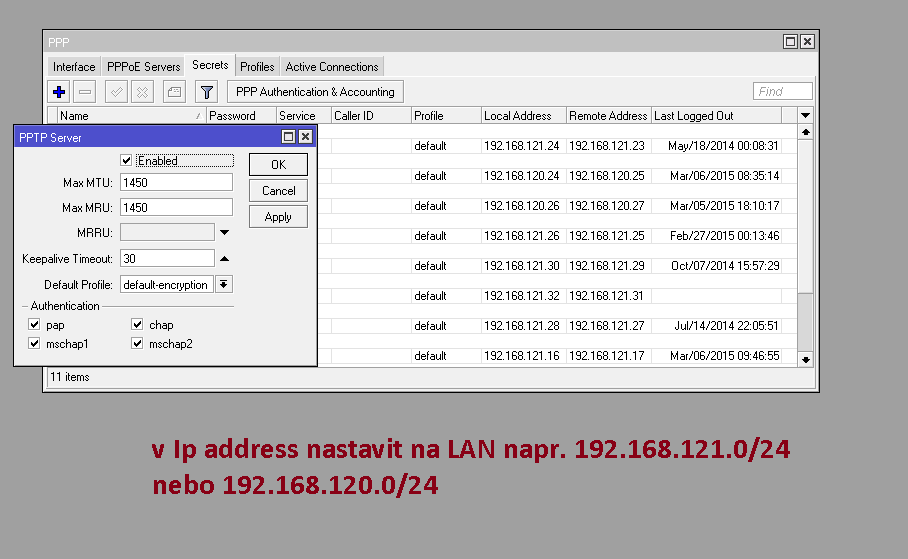 pepulis píše:Staci na strane serveru - Hradec, nastavit to, co je na obrazku (jen prizpusobit IP adresy) a musi to hned fungovat. Na PC jen vytvorim VPN pripojeni s ver. IP Hradce, jmenem a heslem a jede to. Da se pouzit i ovpn atd., ale pro jednoduche spojeni staci i to dle obrazku.