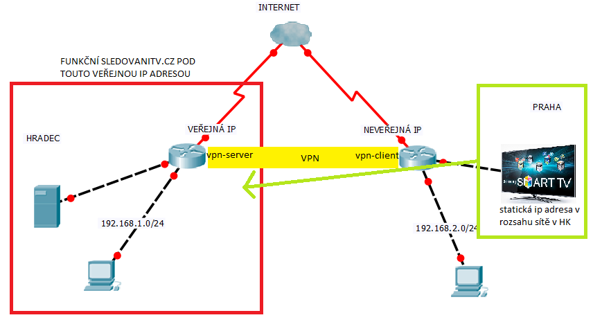 tohle nastavené mám a chodí mi to ale neřeší to můj problém, potřebuji aby se TV v Praze hlásila veřejnou IP z Hradce aby mi fungovala TV po netu kterou podporuje ISP v Hradci. TV vpn klienta neumí, takže musím nějak nastavit sít ve které je tv připojena.