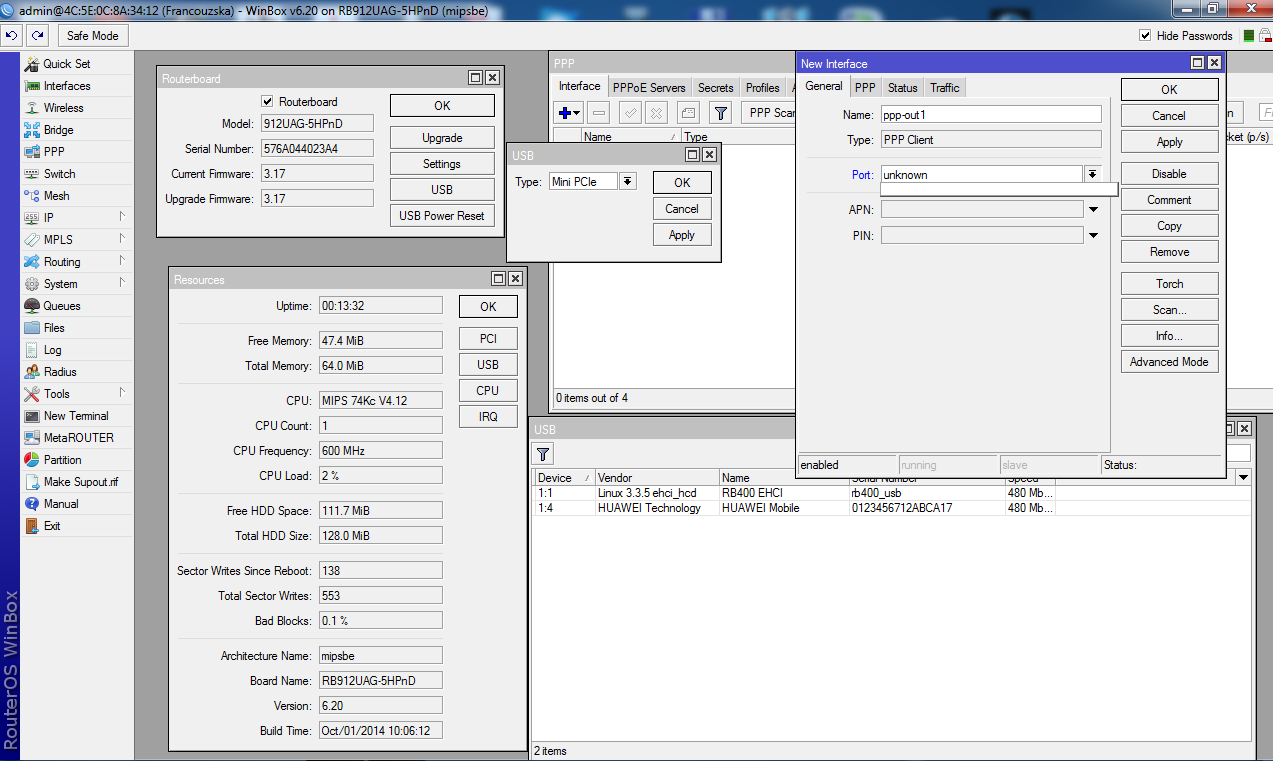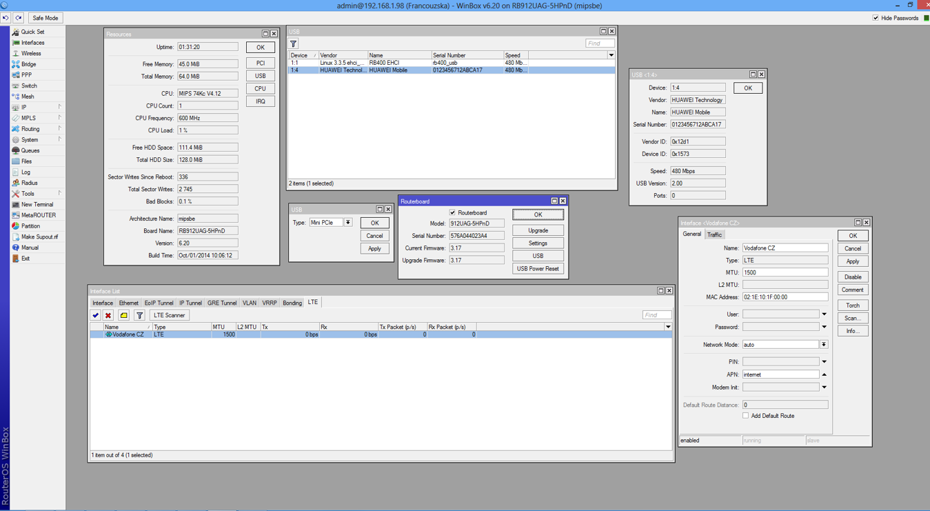 Pořídil jsem tedy RB912 a tvůj zmiňovaný miniPCIe LTE modul od Huawei. Můžeš níže vidět na fotce, jak to dávám dohromady. Problém se vyskytl u konfigurace. Modul je sice v Resources vidět. Musím nejdřív v Routerboard-USB-Type přepnout na MiniPCIe, pak se mi objeví. Takže asi RB s tím nějak komunikuje. První zajímavá věc je, že nesedí S/N se S/N na štítku na modulu. Jakmile se snažím přidat PPP-clienta, tak bych v kolonce Port měl ten modul vidět, ne ? Ale já ho nevidím. Nemám to jak k tomu interface přidělit. Nechybí mi tam nějak package ? Nebo jsem tam zapomněl něco jiného ?