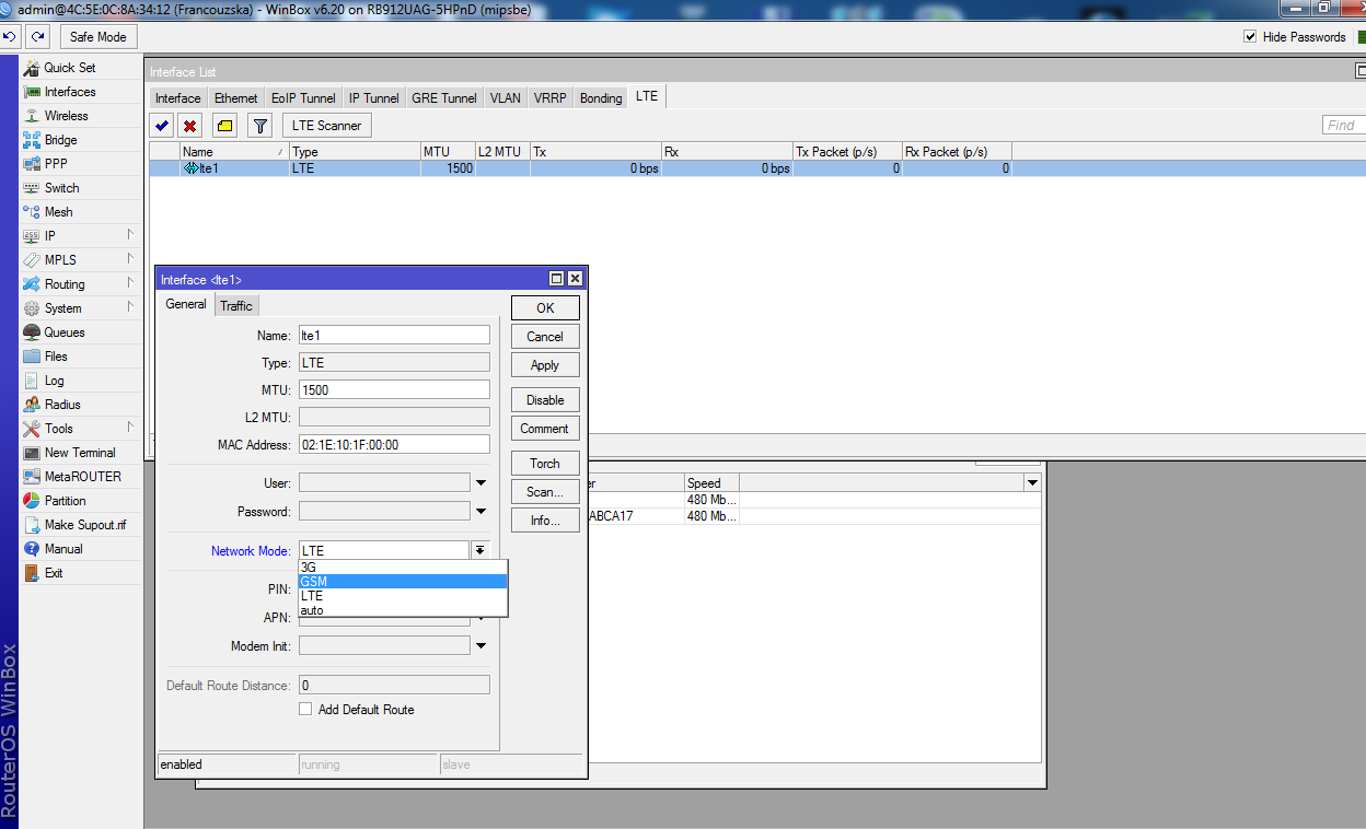 Ano, reboot proběhl. Jo všiml jsem si, že v Interface je přímo záložka LTE a už tam je i LTE vidět. Takže přes PPP client se to nekonfiguruje ? Jaký je další postup? Není tom moc co konfigurovat, max přihlačovací údaje a ty taky naznám, protože jsem tam hodil funkční sim kartu s LTE s donglu K5150 a ten fungoval hned po naistalovaní toho jejich softu do PC.