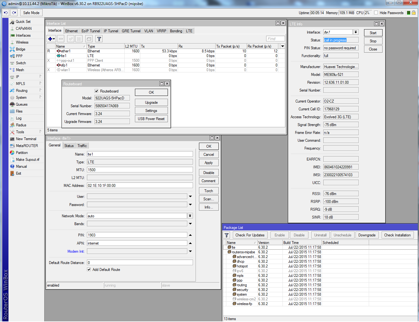 chtěl bych poprosit o radu mám stejnou konfiguraci RB 922UAGS + minipcie Modem Huawei ME909u-521 a nechce se mi registrovat LTE. SIM je na LTE funkční v mobilu například. Data jsou aktivní, a používám ji jako běžnou i včetně volání.