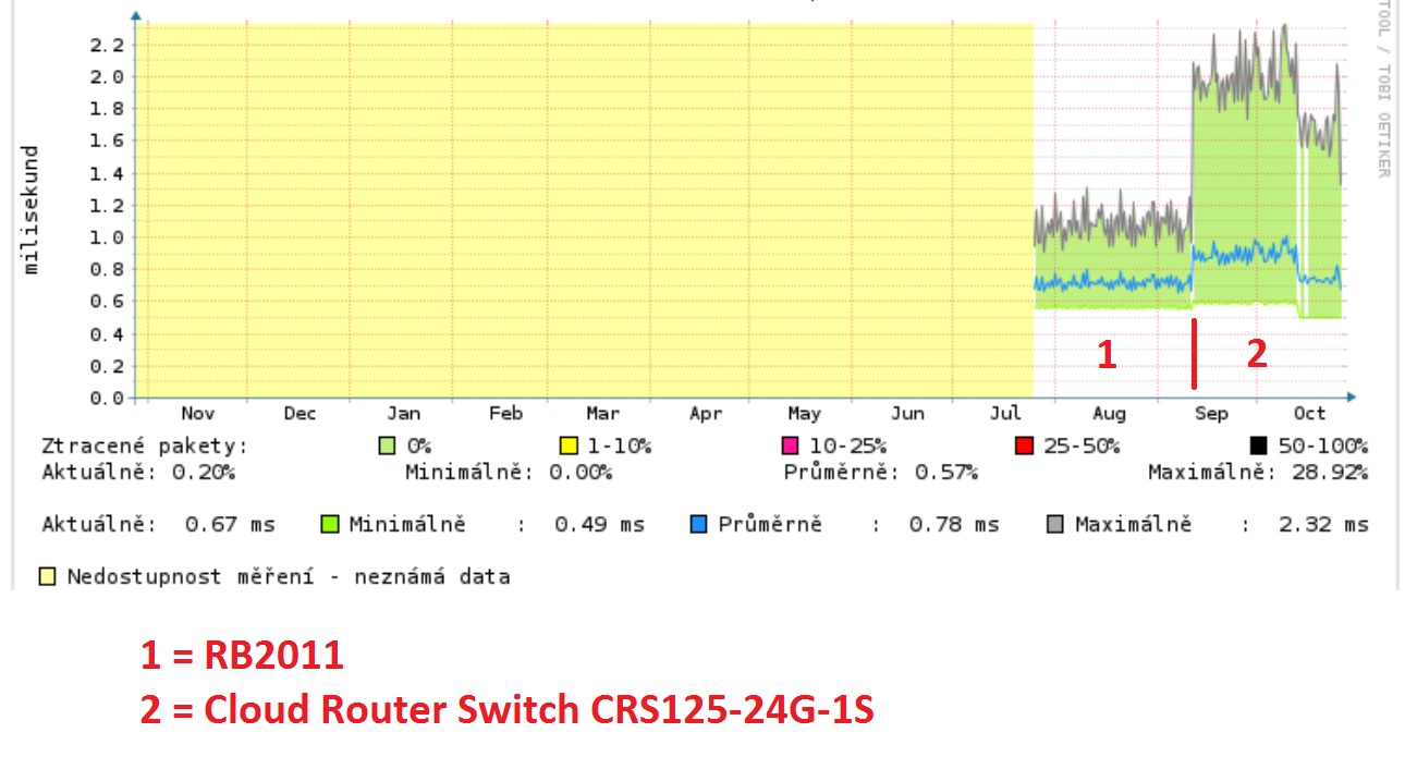 okoun píše:3com píše:Nějak nechápu proč ten rozdíl v odezvě po výměně RB2011 za CRS125.... Nejen , že nárůst odezvy ale dokonce ve špičce je tam i mírný Packetlost občas, který na RB2011 nebyl vůbec... Nastavení je úplně totožné jak bylo na RB2011 bridge a všechny porty v něm (žádný firewall nat nic, CPU jede max 22% při max toku)... RB se měnil jenom proto, že RB2011 už byl plně osazen včetně SFP portu a byl potřeba další lan port... Viz screen grafu odezvy, kde je mezi serverem co graf kreslí a tím switchem pouze licencovaný spoj...