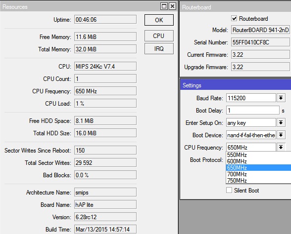 Můžeš jsem dát prosím fotku z Winboxu Resources a Routerboard setings ? Doufám, že i když to má 16MB , že se mikrotik vejde komplet.