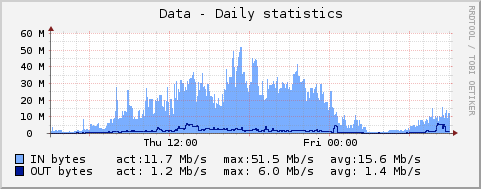 chybné zobrazení datového toku 12:00 a 18:00 způsobeno nasazením nejnovější verze 6.34 ve které docházelo ke špatnému vyčítání grafů, ve winboxu byl datový tok normální 20-30 mbps, v 18:00 proveden downgrade na 6.32.3 (Bugfix only) a je vidět, že vyčítání grafů opět začlo fungovat správně.