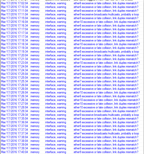 Často to dělá různý haluze ve stylu že se v grafu přenášených dat ve winboxu oběví špička na hodnotě třeba 20Gb/s a podobně. V logu to přitom háže "ether 7 excessive or late collision, link duplex mismatch? a také "excessive broadcasts/multicasts, probably loop?".
